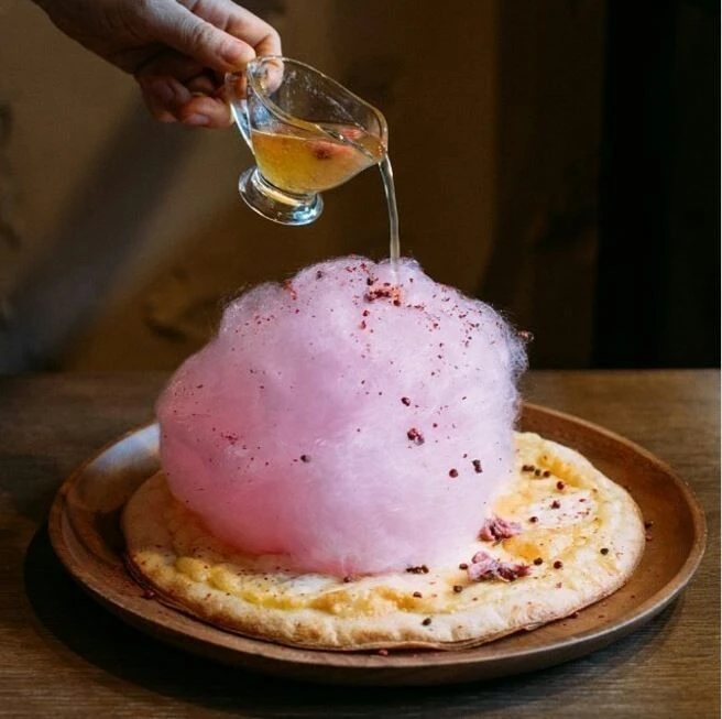Schmatz Beer Dining - ресторан в немецком стиле в Токио, Япония. В одном из их блюд поверх пиццы используется сахарная вата и сироп