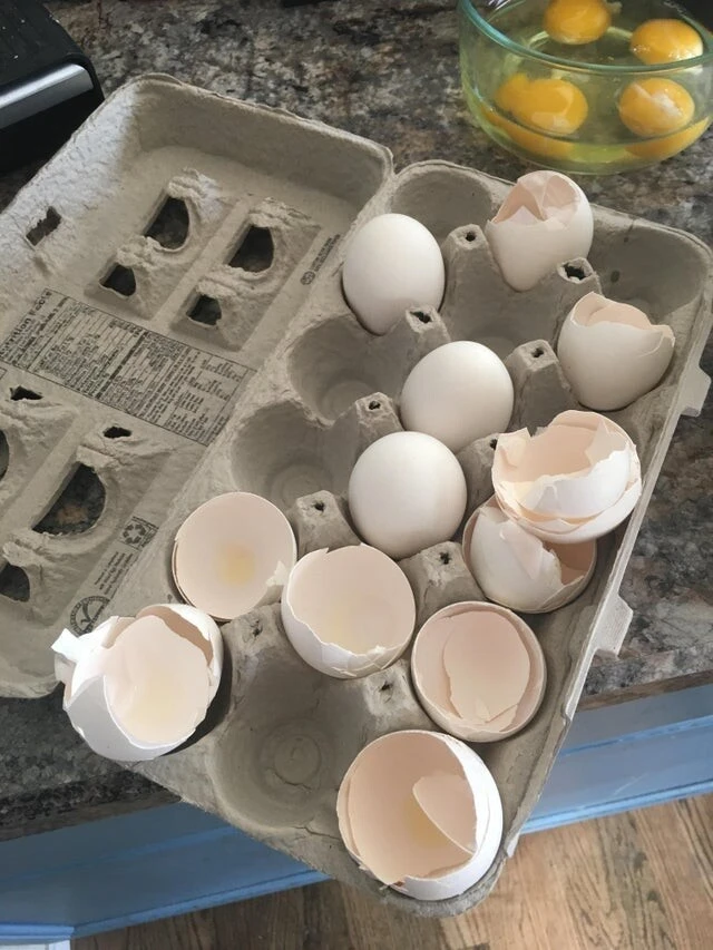 Жена готовит яичницу и кладёт скорлупу обратно в упаковку ![]()