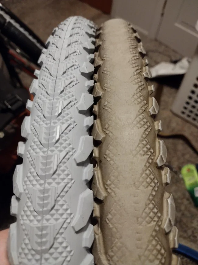«Совершенно новая шина для инвалидной коляски по сравнению с 2-летней шиной, замененной как раз перед снегопадами»