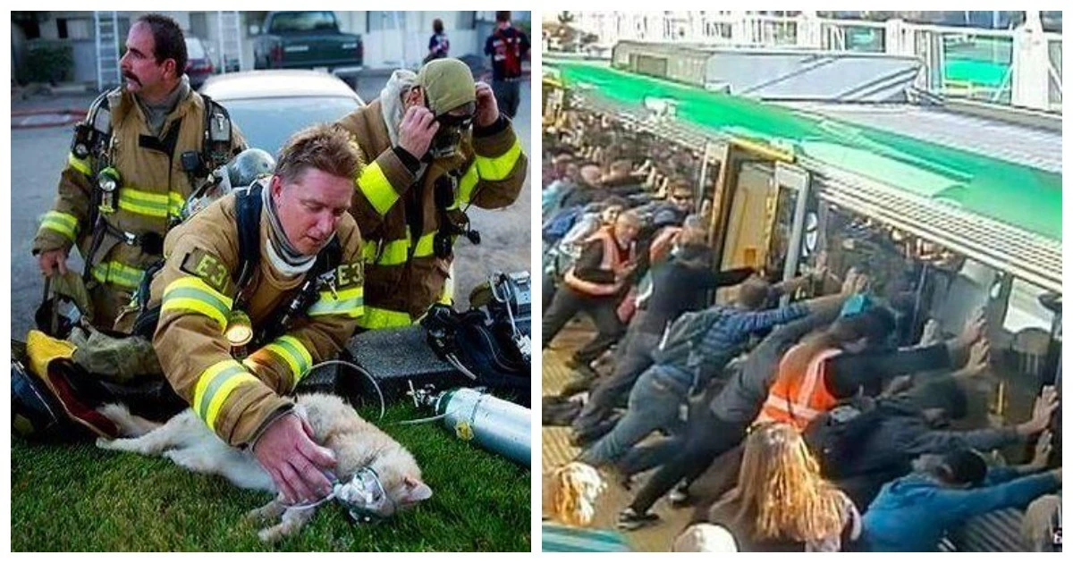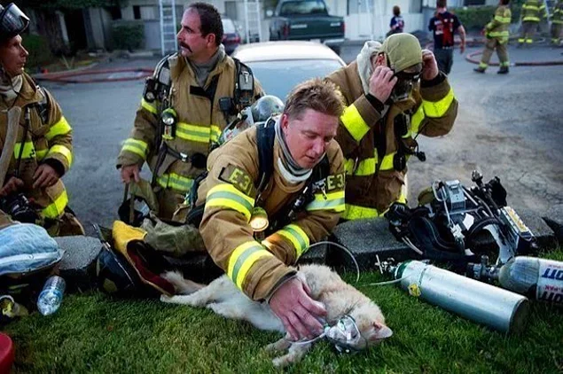 20. Собака благодарит пожарного после того, как он спас ее щенков.