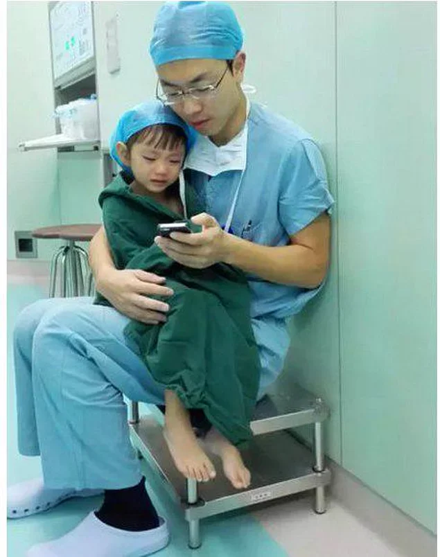 17. Хирург утешает плачущую девочку перед операцией, смотря с ней мультики