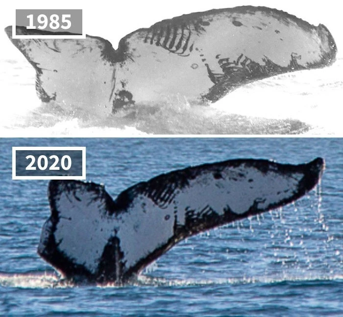 Один и тот же кит с поврежденным хвостом , сфотографированный с разницей в 35 лет у побережья Мексики.