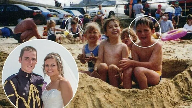 Пара нашла друг друга на одной и той же детской фотографии, сделанной за много лет до того, как они познакомились и поженились. Они жили в 500 километрах друг от друга и оказались на пляже одновременно только потому, что семья мальчика случайно заехала туда на отдых.