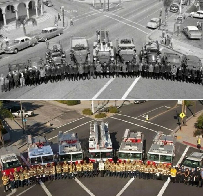 19. Групповое фото пожарной службы калифорнийского города Редлендс, 1958 и 2012 годы