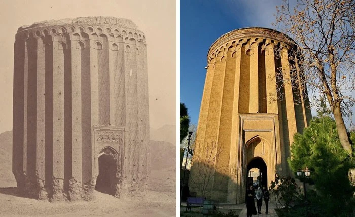 17. 1000-летняя башня Тогрол в городе Рей, Иран. Фотография слева была сделана в 1840-х годах