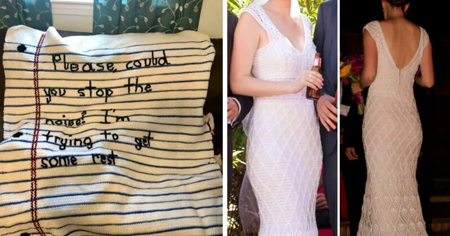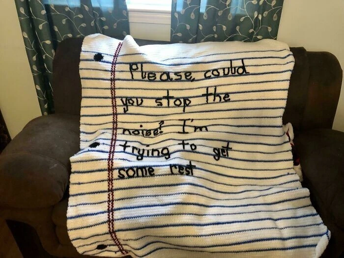 "Я связала небольшой плед в форме листа бумаги со словами песни любимых Radiohead" ![]()
