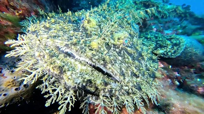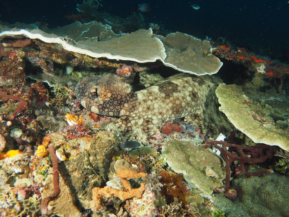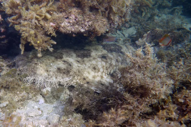 Да, гроза морей из воббегонга никакущий. Зато засадный хищник — превосходный. Бахрома на морде лица и камуфляжный окрас позволяют рыбине раствориться среди кораллов даже днём. А ночью рыб полностью сливается со дном. Идеальная позиция для охоты.