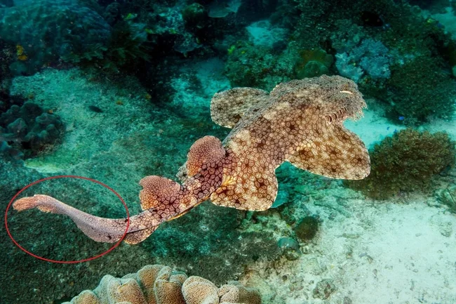 Воббегонг — акула. Правда, никудышная. Он послал стандарты акулостроения максимально далеко. Вместо того, чтобы прокачивать скорость и силу, рыб вложил все очки своего развития в скрытность. Плоское тело, короткий хвост, куча растительности на лице — с такими характеристиками быстро не поплаваешь.