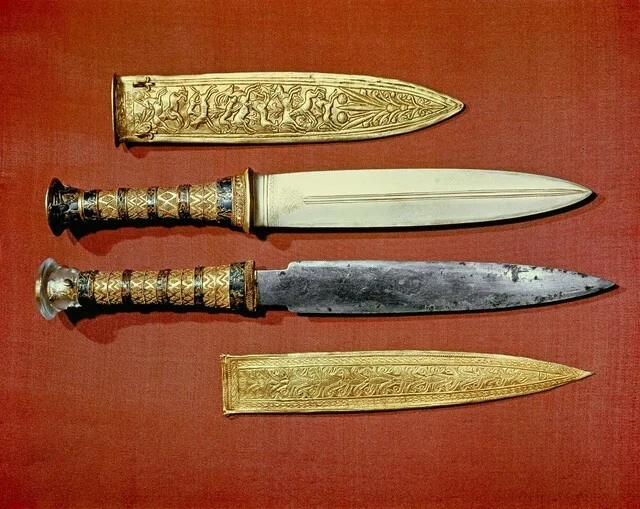 При исследовании мумии Тутанхамона были обнаружены древние кинжалы, у одного из которых было железное лезвие с золотой ручкой и хрустальным набалдашником
