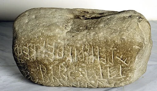 Блок песчаника VI в. до н.э., весом 143 килограмма, найденный в руинах Олимпии, с высеченной надписью: «Бибон, сын Фолоса, перекинул это через голову одной рукой»