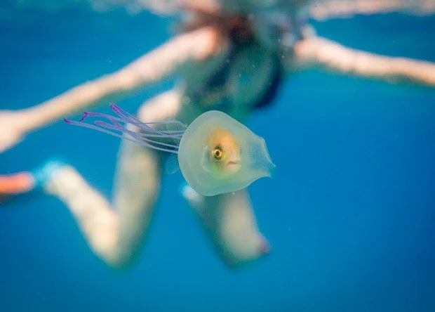 2. Фотограф Тим Сэмюэл сделал снимок рыбы, плавающей внутри медузы. Хотя её и проглотили, но рыба находится в безопасности и может управлять направлением движения медузы.