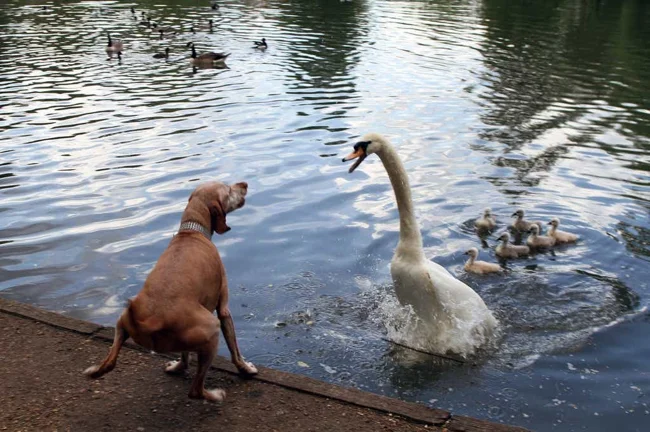 13. Лебеди недолюбливают собак, и иногда нападают на них, пытаясь задушить