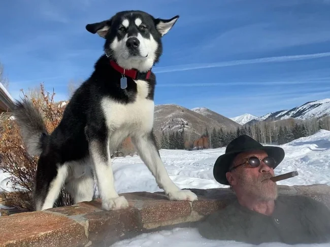 Кайфует со своим псом по кличке Датч. Арнольд приютил красавца прошлым летом.