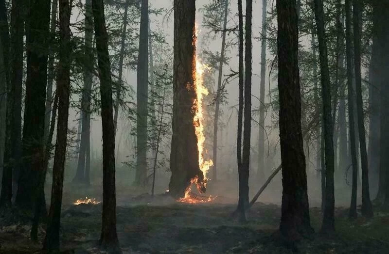 Дерево горит недалеко от села Тастахский наслег в Якутии в августе