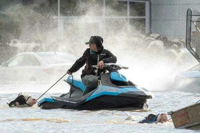 Спасение коров из затопленных сараев в канадском Абботсфорде: ливни вызвали оползни и наводнения в ноябре