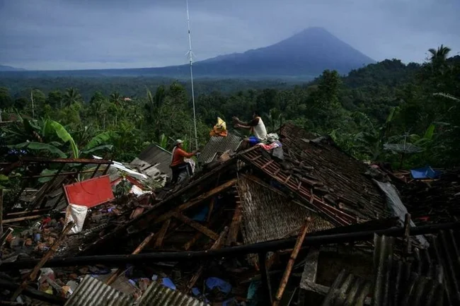 Жители индонезийского городка Лумаджанг отыскивают свои вещи после землетрясения в апреле
