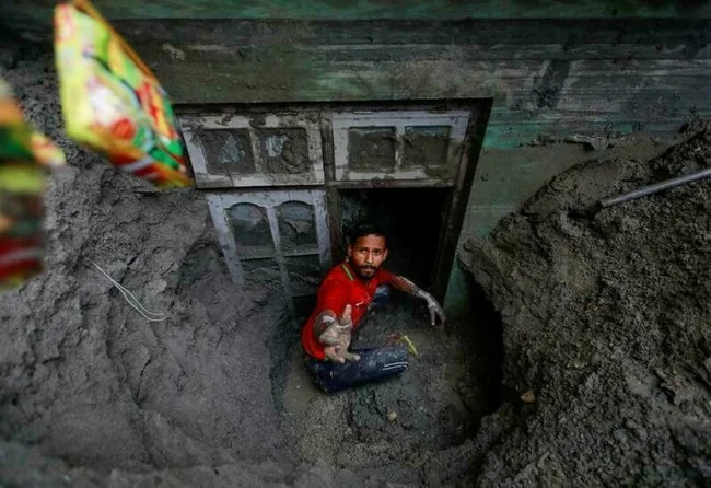 Мужчина пытается откопать свой дом в районе Синдхупалчок, Непал, где произошло неожиданное наводнение в июне