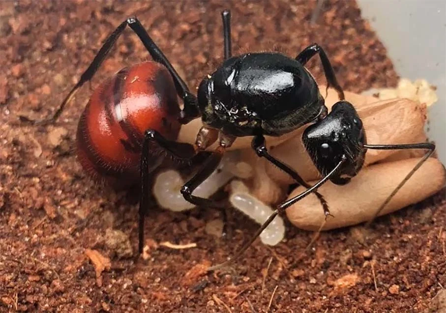 Найдя укромное место, королева откладывает первую партию яиц, за ними придётся ухаживать самостоятельно. В первом поколении появляются только рабочие — относительно небольшие муравьи. Росточку в них «всего» 2,2 сантиметра. Когда первое поколение насекомых вырастет, оно отправится на поиски пропитания. А именно: на поиск домашних животных!