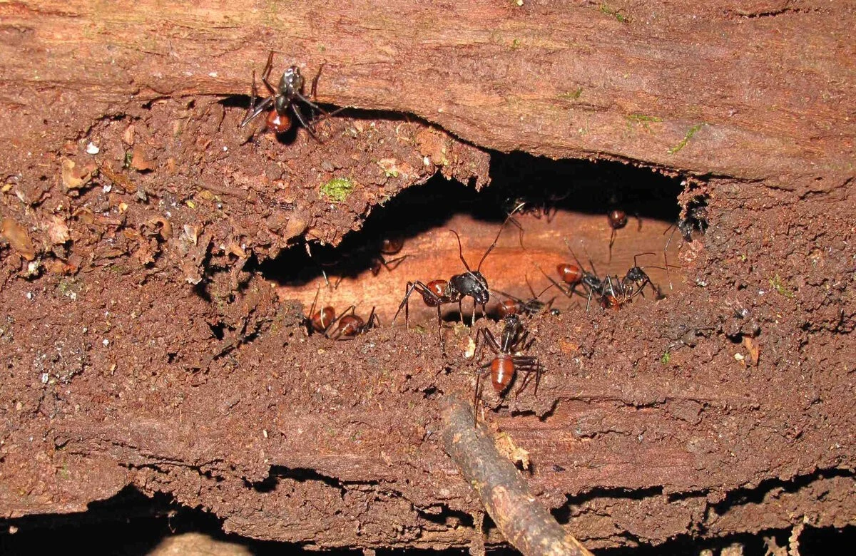 В матке не меньше 3 сантиметров длины. Она чисто физически не способна поместиться в узких тоннелях муравейника из земли и песка. Поэтому сразу после оплодотворения самка прячется под камни или в трухлявую древесину.