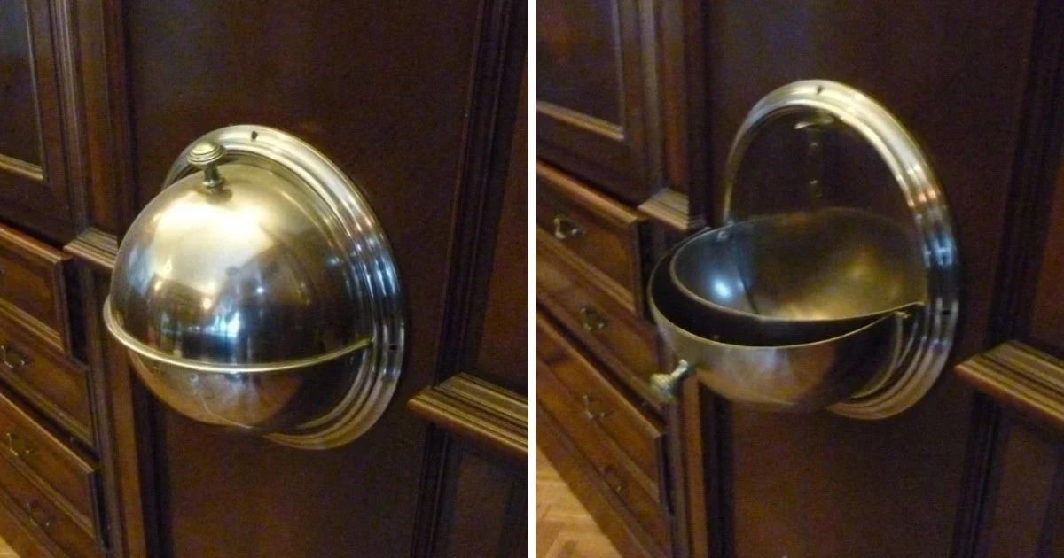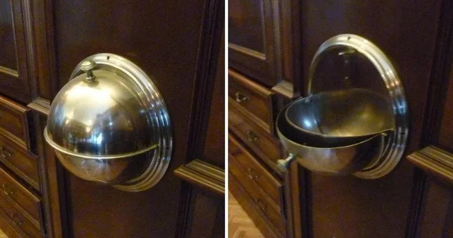 Блестящий металлический купол прикреплён к стене У него сверху есть ручка. Когда его тянут, он открывается, обнажая заднюю часть