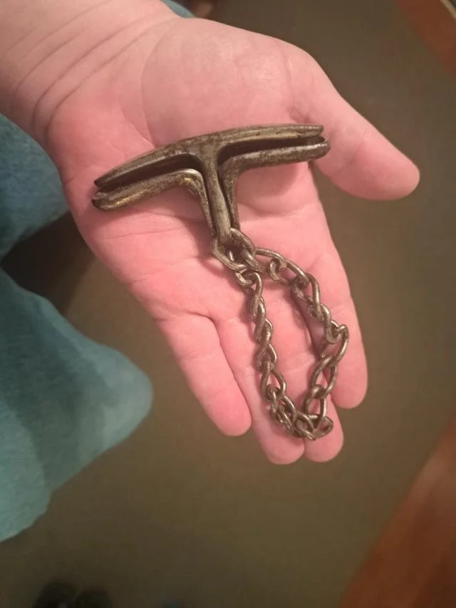 Интересный, но непонятный инструмент. У него раскручивающиеся концы с цепочкой с одной стороны и проволочной петлёй с другой