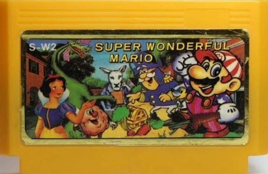 Также, меня сильно позабавил картридж с пиратской игрой "Super wonderful Mario", где был изображен вообще непонятный набор персонажей, в том числе и непонятно откуда взявшаяся Белоснежка. Ну а про Марио в странной кепке и с бейсбольной битой в руках я вообще молчу.