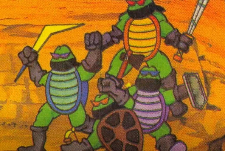 Я думаю, что многие игры в игры про Черепашек ниндзя, и скорее всего данное изображение вы тоже встречали. Не знаю, что рисовал этих черепах, но судя по всему мультсериал он не смотрел. Почему панцири черепах в полосочку, и почему у них такое странное вооружение? Что за бумеранг? Что за лук? Что за топор? Что за щит? Что за меч?