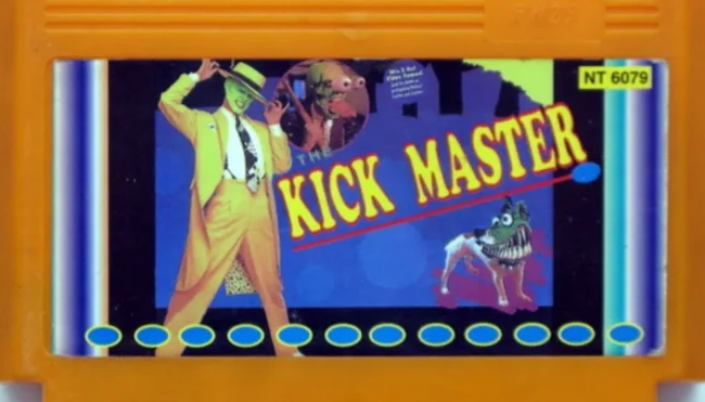 Ну а с игрой "Kick master" вышла та еще хохма. Не знаю, чем руководствовались товарищи пираты, но они серьезно налепили на картридж с игрой "Kick master" Маску, то есть персонажа Джима Керри из фильма "Маска", а также его культовую собаку Майло. Где связь?