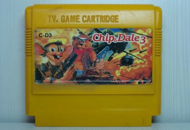 Ну а дальше у нас классика. Официально на приставке "NES" выходило лишь две части игры "Чип и Дейл спешат на помощь". Но в больном воображении пиратов родилась идея создать третью часть игры, а точнее заменить бойцов из игры "Heavy barrel" на двух голых бурундуков с огнестрелом в руках. Но упоротость заключалась не только в этом, а еще и в том, что на самом картридже был изображен Фэйвел Мышкевич из мультфильма "Американский хвост", которого налепили на тело военного с пистолетом. А на заднем плане виднелся какой-то непонятный медведь, а также вертолеты и взрывы. В общем полный трэш и угар.