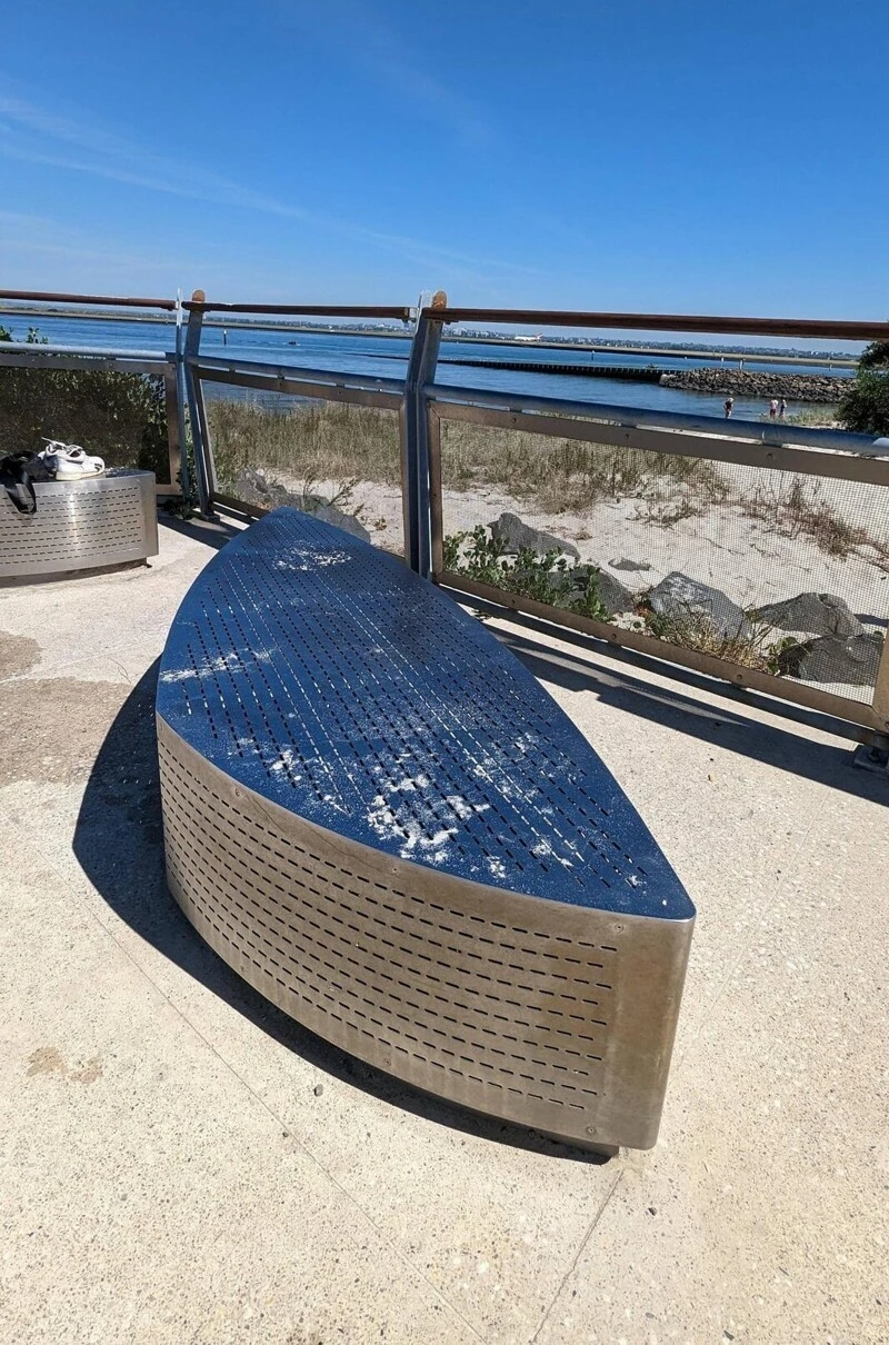 10. Скамейка из нержавеющей стали на пляже. Температура сегодня составляет 31°C