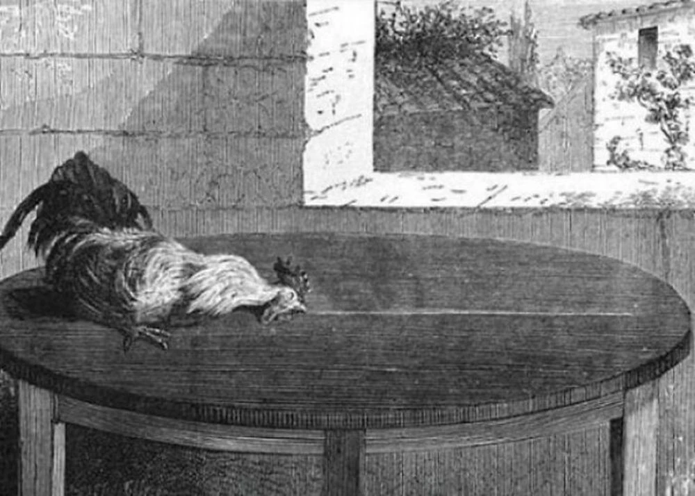 25. Если удерживать голову курицы неподвижно и нарисовать перед ней прямую линию, пока курица смотрит, это ее загипнотизирует ![]()