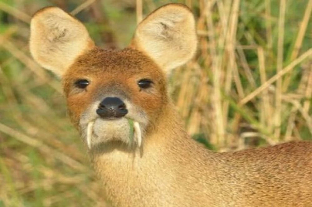 15. Это водяной олень или болотная кабарга. У него нет рогов, зато есть бивни вместо зубов, за которые его прозвали «оленем-вампиром»