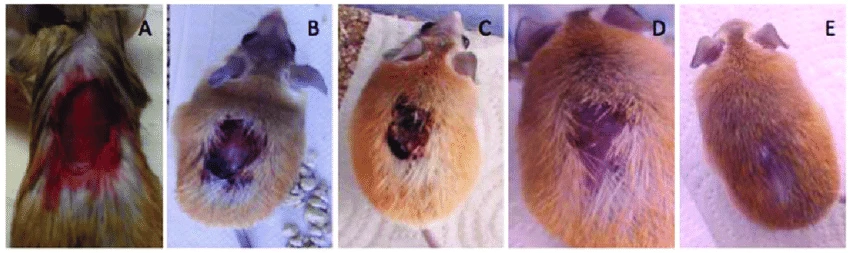 Мышь спустя полтора месяца после травмы, полученной в сломанном беговом колесе