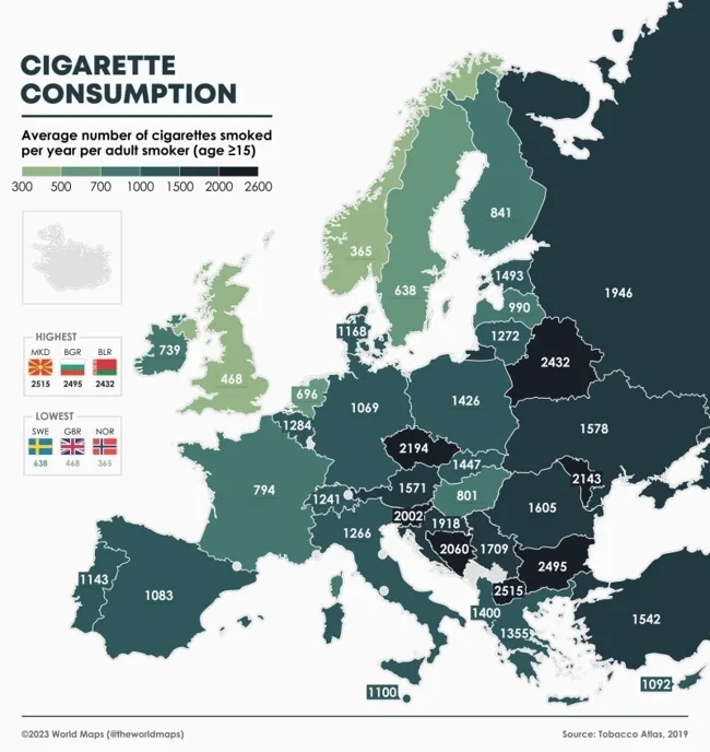 26. Среднее количество выкуренных сигарет на одного взрослого курильщика в год