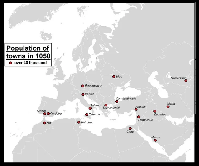 29. Крупнейшие города Европы, Северной Африки и Западной Азии в 1050 году (население более 40 тыс. человек)