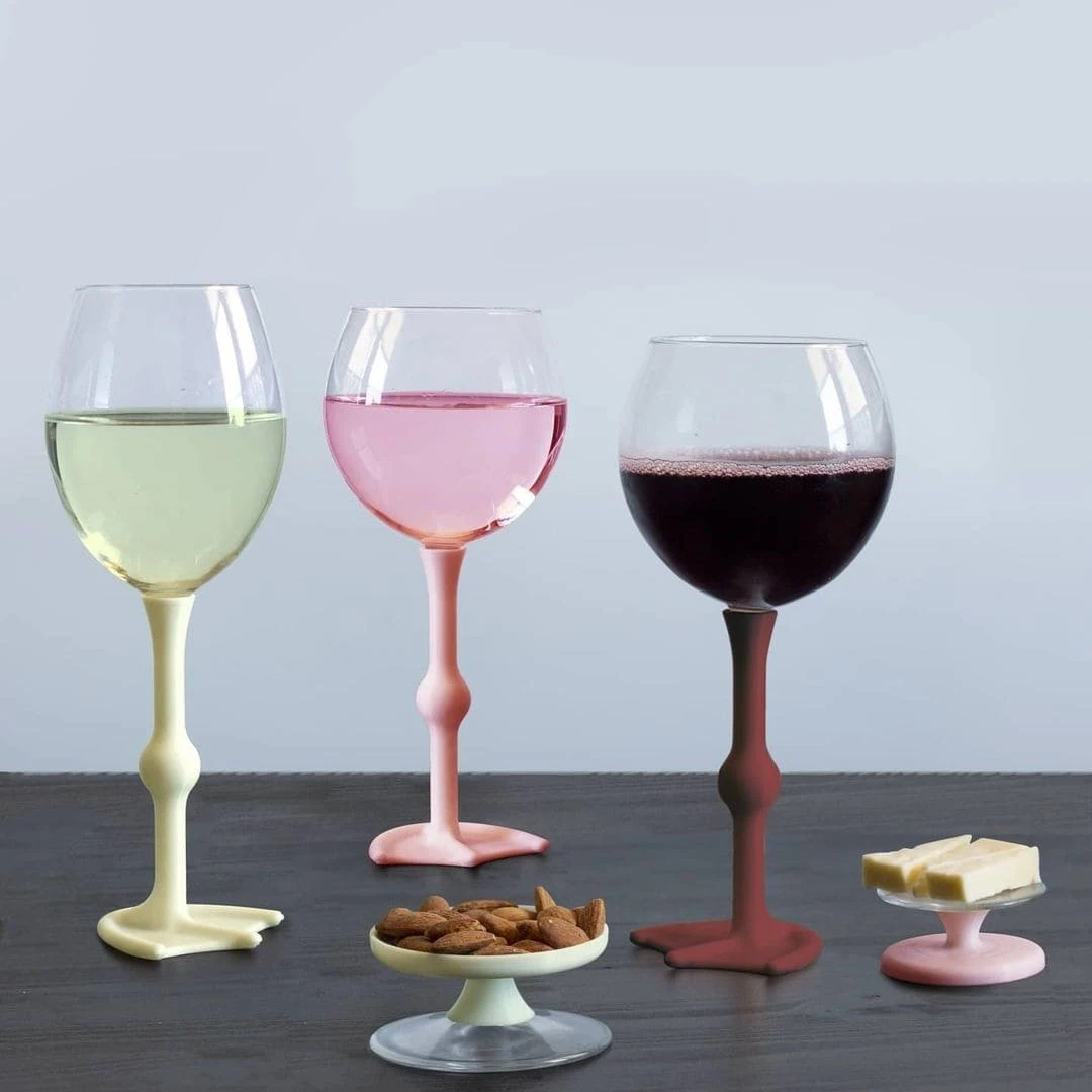 На самом деле эти силиконовые лапки предназначены для бокалов, у которых разбилась ножка, и чтобы не выбрасывать их, дизайнер нашла решение, вдохновившись фламинго.