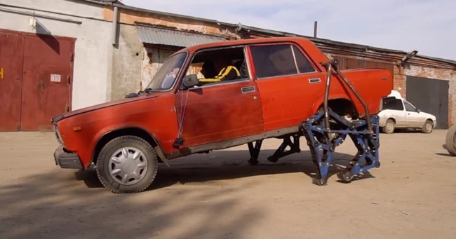 Мужчины решили модифицировать «Жигули» и сделали из неё шагающую машину, видимо, решив, что эта легенда заслуживает жизни в киберпанке.