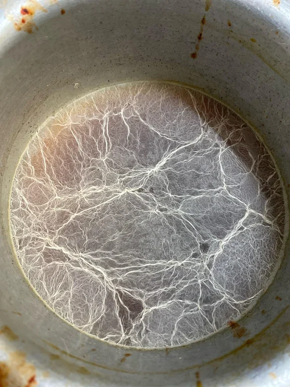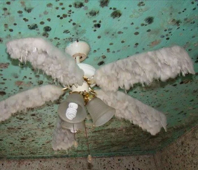 Наверное, владельцу подвала было неприятно увидеть это на своём потолке, но выглядит забавно: будто кто-то вычесал кота и приклеил туда его шерсть, куда не следует.