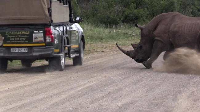 А еще с рогом можно идти на таранный удар! Хотя в случае нашего упитанного «единорога» можно обойтись без рогов. Полутора-двухтонное тельце способно рвануть на стометровке со скоростью 60 км/ч, а это фактически столкновение со свирепым живым внедорожником. Кстати, реальных внедорожников зверь абсолютно не боится. Периодически рассвирепевший носорог поддевает или вовсе переворачивает машины.