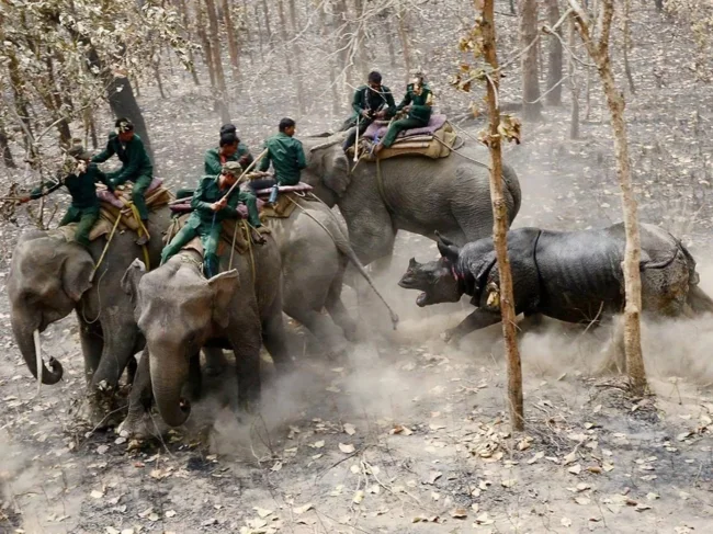 Индийский носорог — один из самых мелких видов носорогов. Но даже он не боится пойти против стада слонов.