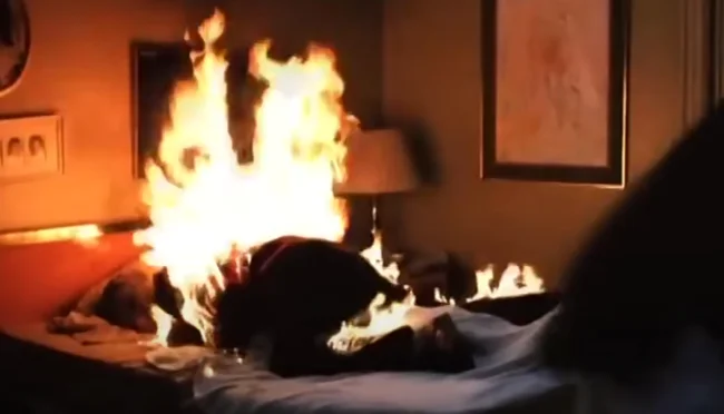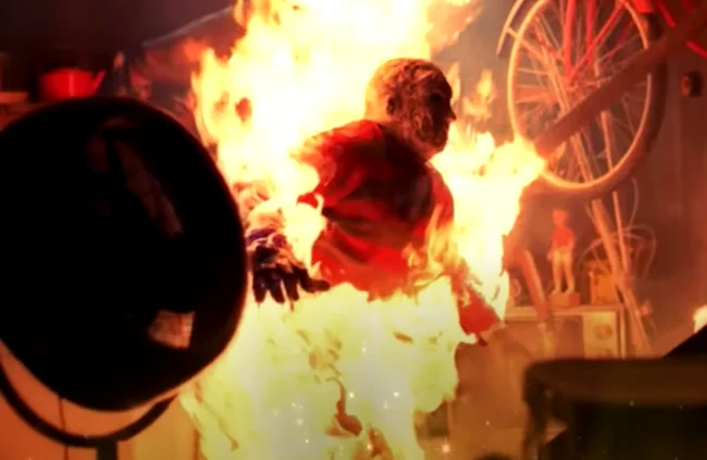 22. В сцене, где Фредди горел, роль маньяка исполнял каскадер, одетый в специальный огнеупорный костюм. После съемок сцены члены съемочной группы тушили горящего каскадера. Даже исполнительница главной роли Хизер Лэнгенкэмп подбежала с огнетушителем.