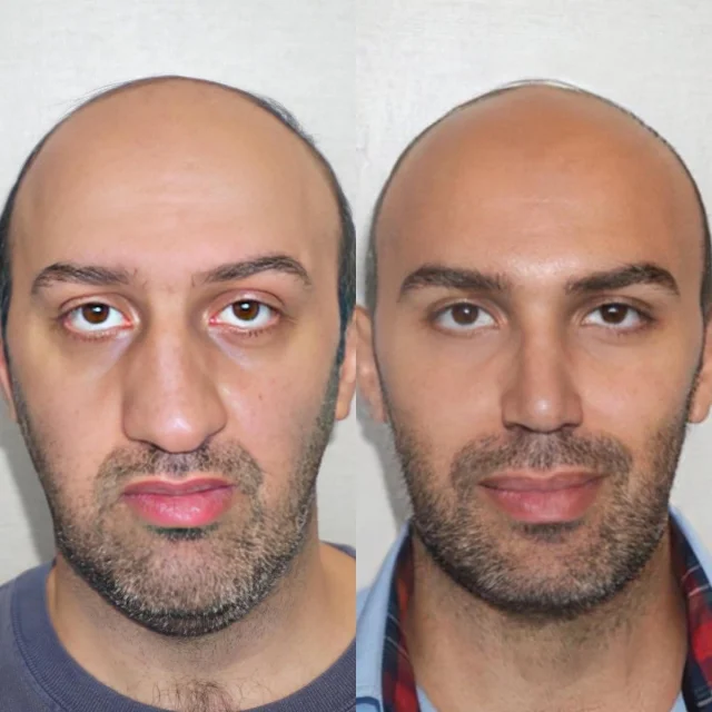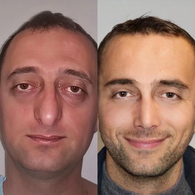 Мужчина спустя 3 года после ринопластики, лазерной липосакции подбородка и омоложения нижних век.