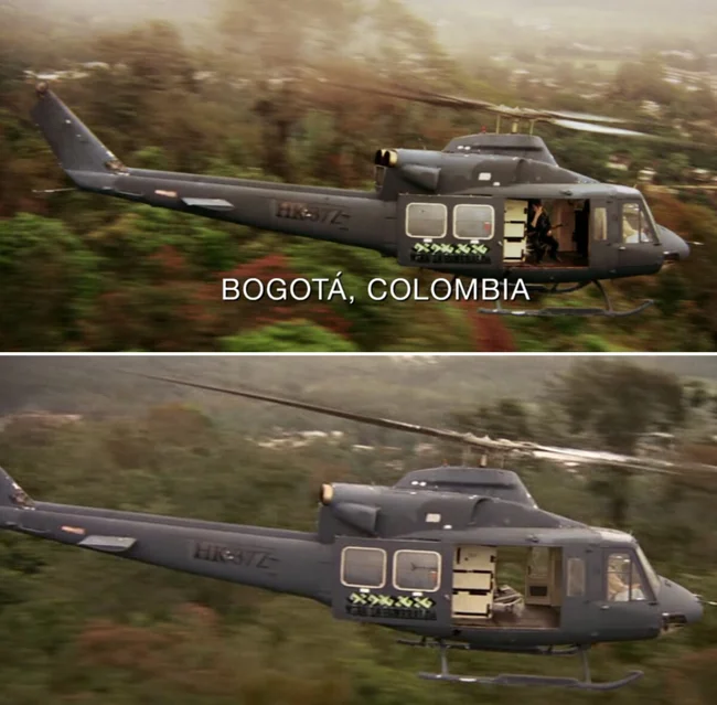14. Сверху: вертолёт, пролетающий над Боготой в «Смитах». Снизу – тот же самый вертолёт, но из фильма «Прямая и явная угроза» (1994). Видимо весь бюджет ушёл на Питта и Джоли (см.п.21). Здесь хватило только дорисовать экипаж.