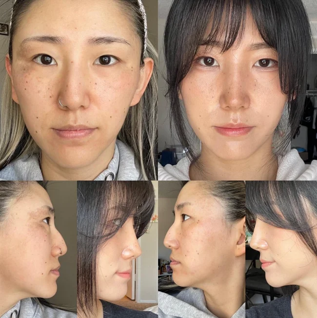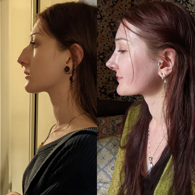 "На фото вы можете видеть результат спустя год после операции. Моей целью было убрать горбинку с носа и уменьшить ноздри, но чтобы длина носа оставалась прежней. И моя цель исправления подбородка состояла в том, чтобы он у меня хотя бы был. Я хотела, чтобы он стал более чётким, особенно вид с бокового ракурса. Доктор также подправил имплант, чтобы свести к минимуму ассиметрию моего родного подбородка. Я в полном восторге от результатов! Единственное о чем жалею, что не сделала этого раньше ????".