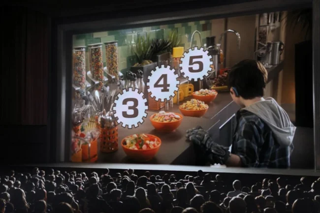 При наступлении соответствующей сцены на экране возникала цифра и посетитель кинотеатра снимал с нужного масла защитную пленку.