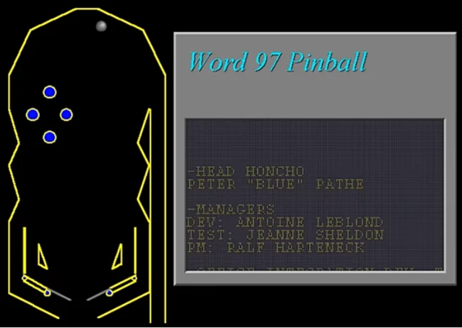 Разработчики Word тоже решили не отставать от своих коллег по цеху и "зашили" в текстовый редактор простенькую игру пинбол. Правда, 2/3 экрана занимала не игра, но имена программистов. Впрочем, пинбол был создан для того, чтобы пользователю было нескучно пока проплывают титры с именами разрабов. Такая забота!