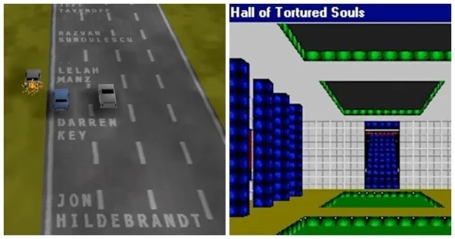 Однако это не все. пройдя вперед в темный дверной проем, пользователь оказывался в темном закутке, по стенам которого кровавыми титрами стекают имена замученных разработчиков.