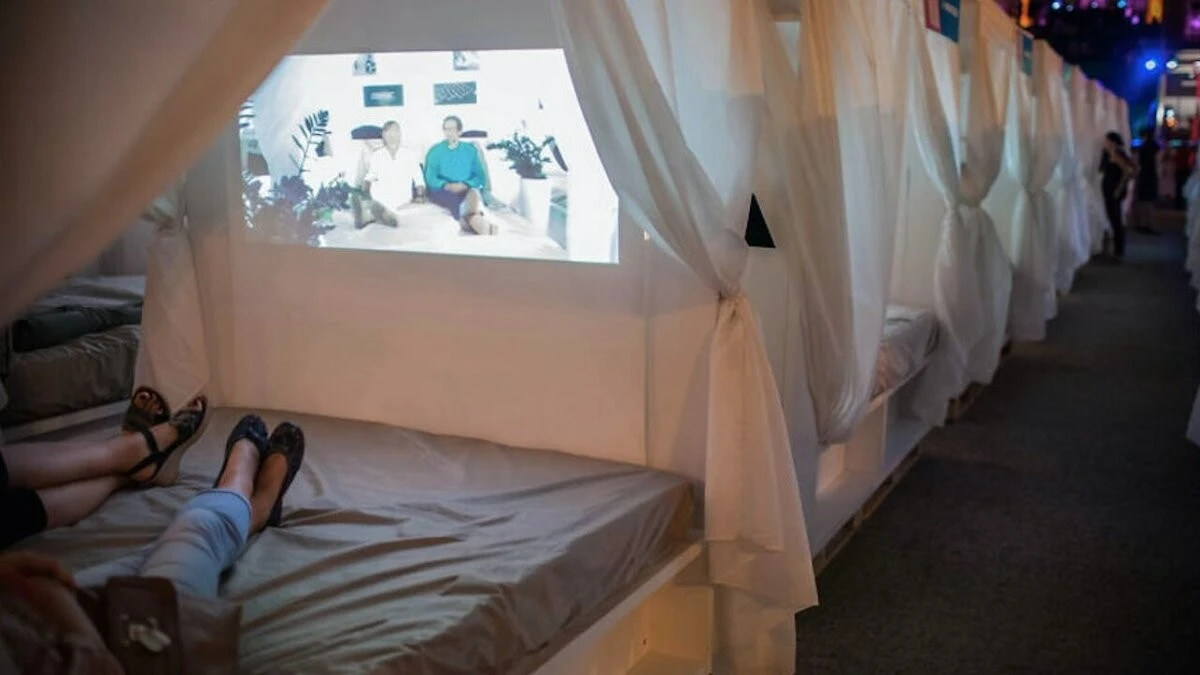 Но это идея сегодня уже перестала быть уникальной, ведь её используют по всему миру. Например, в Польше, где находится Cinema In Bed. В отличие от французского аналога, где вы лежите у всех на виду, здесь можно создать интимную обстановку: каждая кровать имеет ограждения, и в случае необходимости можно полностью скрыть её занавеской.