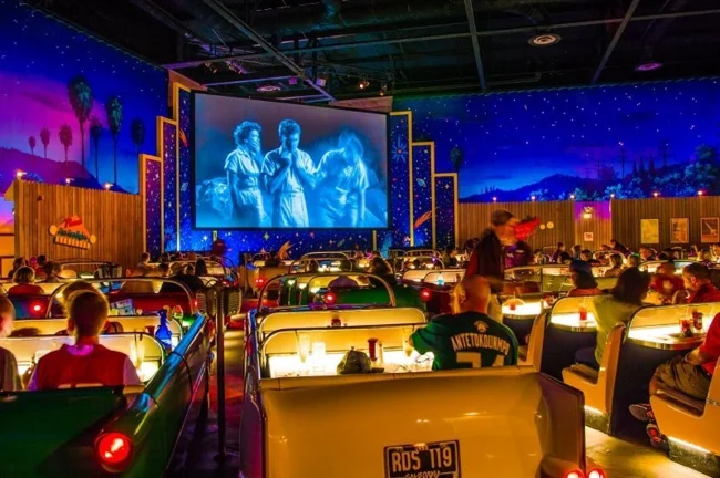 Американское кафе-кинотеатр Sci-Fi Dine-In, созданное при студии Disney, дает возможность не только посмотреть фильм, но и вкусно покушать. А главное, что зрительские места сделаны в виде ретро-автомобилей, разделенные на места по двое.