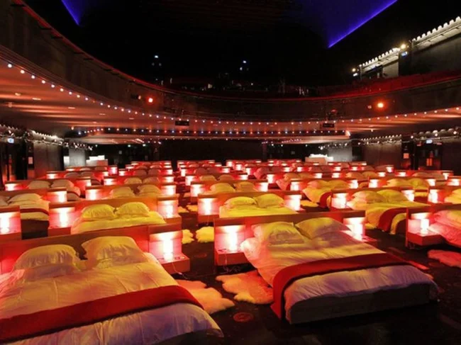 Парижский Olympia Music Hall периодически проводит акцию с известным магазином IKEA. На это время мюзик-холл превращается в необычный кинотеатр, в котором зрительские кресла заменяются кроватями. Всё это создает «домашнюю» атмосферу. Хотя смотреть кино дома все предпочитают по-разному.